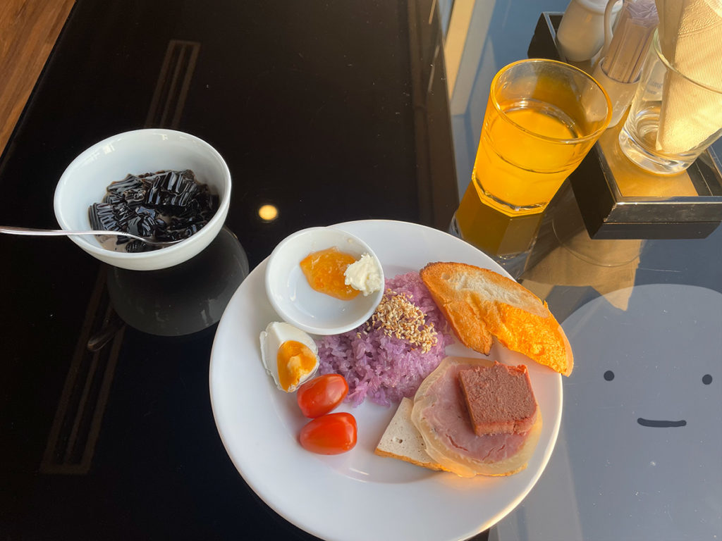 ホテルのレストランでの朝食と、そこから見える景色。ほぼ東京。
